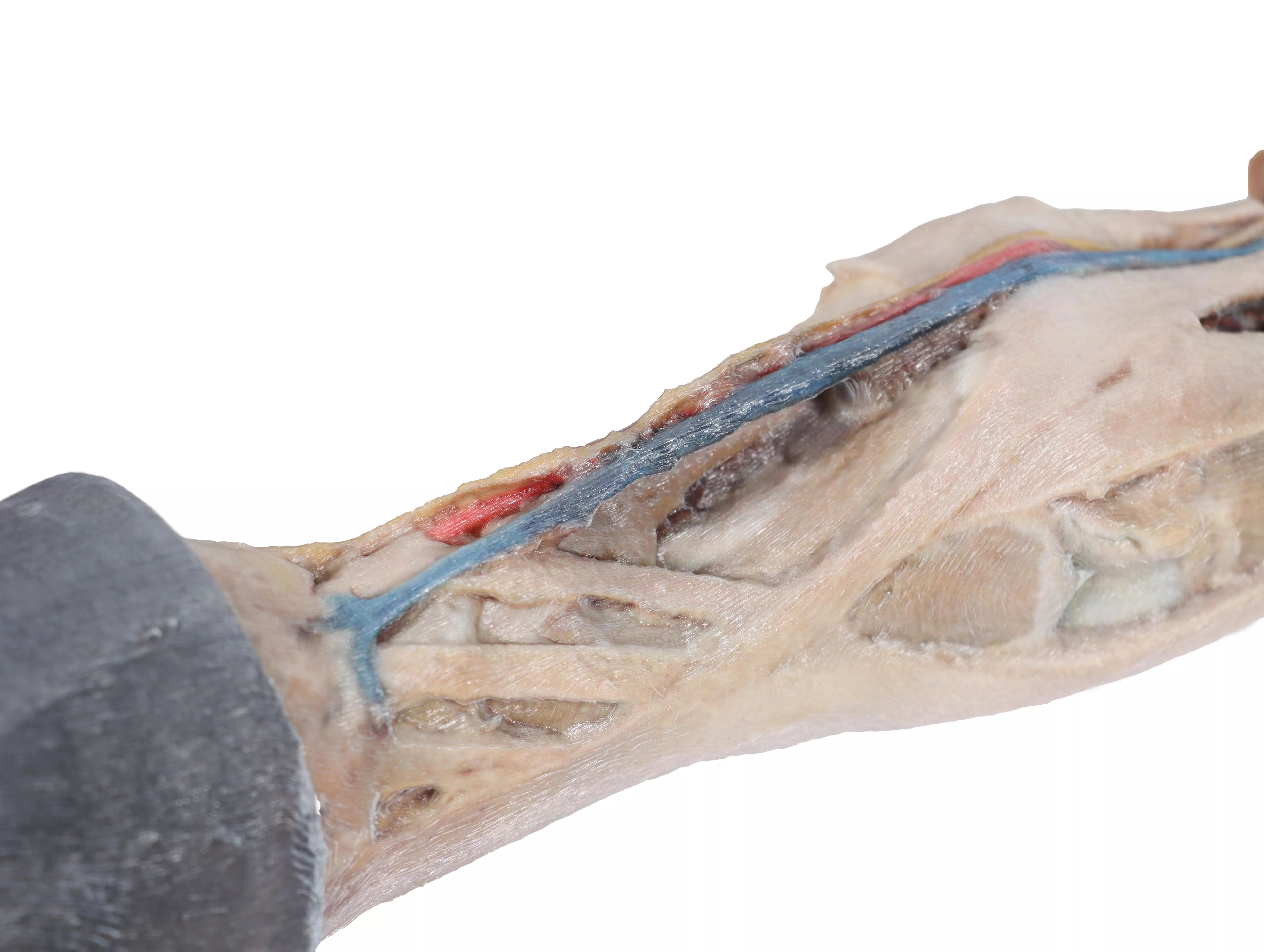 This dissected right-foot specimen displays a mixture of the vascular, nervous, ligaments and tendons. The plantar digital neurovascular bundles both sides of the flexor tendons. The two digital extensor tendons are identified in the proximal dorsal aspect of the specimen. Metatarsophalangeal and proximal interphalangeal joints show all ligaments. Between the plantar aspect of the metatarsal bones and the digital tendon flexors is the interosseus ligament with its sesamoid and extensor branches.
