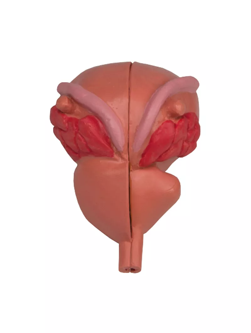 Dieses einzigartige Modell sollte in keiner Arztpraxis fehlen, denn mit ihm ist es erstmals möglich, einfach und gut verständlich die Erkrankung der Prostata zu erklären. Das Modell besteht aus zwei Teilen. Die eine Seite zeigt die gesunde Prostata und die andere Hälfte eine Benigne Prostata Hyperplasie (BPH). Bei dieser erkrankten Hälfte ist der verengte Harnkanal und die nach oben gedrückte Blase mit der daraus resultierenden Restharnbildung sehr deutlich zu erkennen. Auf Stativ.