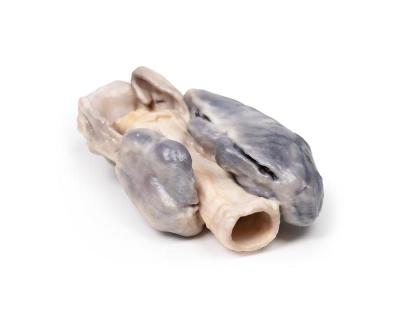 Das entnommene Präparat umfasst Kehlkopf, Luftröhre und eine stark vergrößerte, mehrlappige Schilddrüse. Besonders der rechte Schilddrüsenlappen ist deutlich vergrößert mit zwei großen Lappen, die sich 7–8 mm nach oben und unten erstrecken – weit über die normalen Grenzen hinaus. Die Speiseröhre wurde posterior geöffnet, um die Rückwand der Luftröhre sichtbar zu machen. Aus dieser Perspektive erscheint der rechte Lappen noch größer, wobei das abnormale Wachstum vor allem am unteren Pol liegt. Keine auffälligen Pigmentveränderungen sind sichtbar, aber prominente Venen sind auf der Oberfläche des rechten Lappens erkennbar.