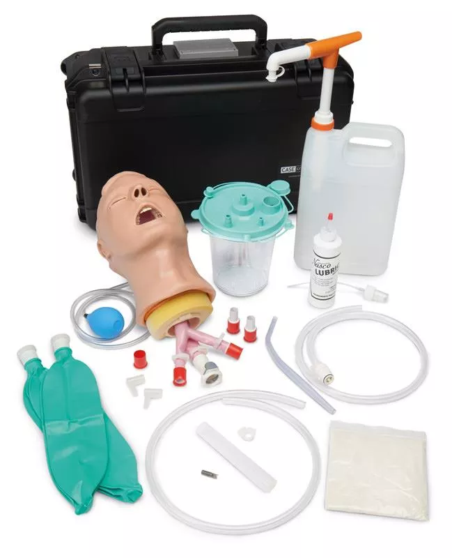 - beinhaltet den “Airway Larry” Erwachsenen-Airway-Management-Kopf, 2 Absaugkanister mit zwei rechtwinkligen Schlauchadaptern, Kanister mit Handpumpe, zwei latexfreie Simulationslungen, Verdickungsmittel, harter Absaugkatheter, 1m transparenter