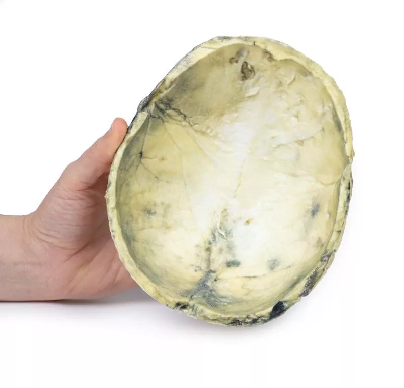 Das Präparat der Schädelkalotte zeigt mehrere nekrotische Läsionen von bis zu 3–4?cm Durchmesser, die die äußere Schädelwand zerstören. Das Periost ist verdickt und entzündlich verändert. Es handelt sich um Gummata, typisch für die tertiäre Syphilis.