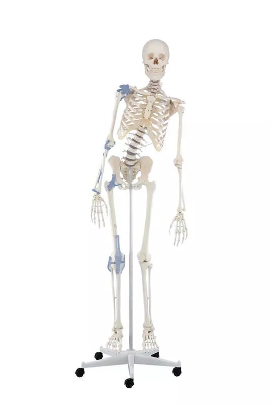 This therapy skeleton offers articular ligaments on one body side in addition to the moveable vertebral column.The model has the following characteristics:- Natural casting of a human skeleton- Representation of all anatomical details, fissures, foramina and processes- Skull can be dismantled in three parts- Removable arms and legs- Gliding joints in shoulder, hip and ankle- Leg can be dismantled at the knee- Removable foot- 5-leg, safety castor-mounted stand- Articular ligaments of knee, hip, elbow and shoulder on one side- Fully moveable vertebral column with flexible intervertebral discs and emerging spinal nervesSize: 176 cm, weight: 9.5 kg Oscar Ref.no. 2960 Willi Ref.no. 3001 Hugo Ref.no. 3014 Otto Ref.no. 3004 Toni Ref.no. 3013 Arnold Ref.no. 3008 Peter Ref.no. 3015 Bert Ref.no. 3010 Max Ref.no. 3016 Details Details Details Details Details Details Details Details Details rigid spine ✓ ✓ ✓ ✓ ✓ flexible spine ✓ ✓ ✓ ✓ muscle marking ✓ ✓ ✓ ✓ Joint ligaments at shoulder, elbow hip and knee ✓ ✓ ✓ ✓ Herniated Disc ✓ Spinal nerves ✓ ✓ ✓ ✓ ✓ ✓ ✓ ✓ ✓ three part Skull ✓ ✓ ✓ ✓ ✓ ✓ ✓ ✓ ✓ detachable arms ✓ ✓ ✓ ✓ ✓ ✓ ✓ ✓ ✓ detachable legs ✓ ✓ ✓ ✓ ✓ ✓ ✓ ✓ ✓ detachable feet ✓ ✓ ✓ ✓ ✓ ✓ ✓ ✓ ✓ sliding joints shoulder ✓ ✓ ✓ ✓ ✓ ✓ ✓ ✓ ✓ sliding joints hip ✓ ✓ ✓ ✓ ✓ ✓ ✓ ✓ ✓ leg separates at knee ✓ ✓ ✓ ✓ ✓ ✓ ✓ ✓ ✓ Roller stand ✓ ✓ ✓ ✓ ✓ ✓ ✓ ✓ ✓ Size incl. stand (cm) 178 cm 178 cm 178 cm 178 cm 178 cm 178 cm 178 cm 178 cm 178 cm weight approx (kg) 9 9 9 10 10 9 9 10 10