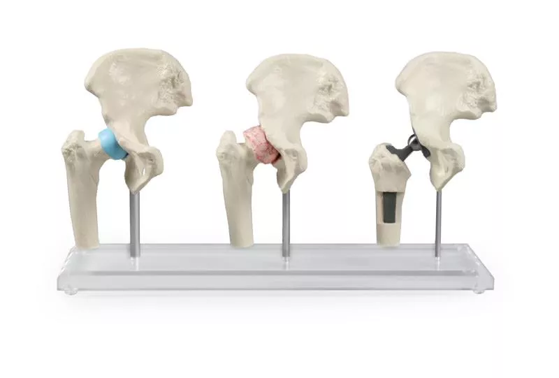 This impressive model shows three scaled down hip models. In addition to the healthy hip this model shows a diseased hip as well as a knee with hip implant. All models are movable, pelvis and femur can be separated, the implant can be removed from the femur. Supplied on plexiglass stand.