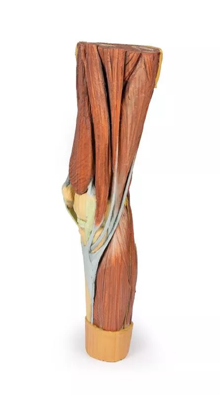 This 3D printed specimen shows a left knee joint in flexion, highlighting the internal joint capsule and surrounding muscles, ligaments, and neurovascular structures.Proximal Thigh & Popliteal FossaThe proximal section includes parts of the quadriceps femoris and sartorius, with the iliotibial tract visible. The popliteal fossa displays the popliteal vessels, tibial nerve, and common peroneal nerve. Posteriorly, insertions of the adductor magnus, gracilis, and posterior thigh muscles (biceps femoris, semitendinosus, semimembranosus) are preserved.Distal Leg & Neurovascular StructuresThe distal section shows muscles of the anterior, lateral, and posterior compartments. Key vessels and nerves include the anterior tibial artery and deep peroneal nerve, posterior tibial artery and tibial nerve, and the fibular vessels. Ligaments & MenisciAnteriorly, remnants of the quadriceps tendon and patellar ligament remain. The anterior and posterior cruciate ligaments and menisci are visible between the femur and tibia. Medially, the tibial collateral ligament and semitendinosus insertion are preserved; laterally, the fibular collateral ligament, biceps femoris tendon, and common peroneal nerve are exposed.