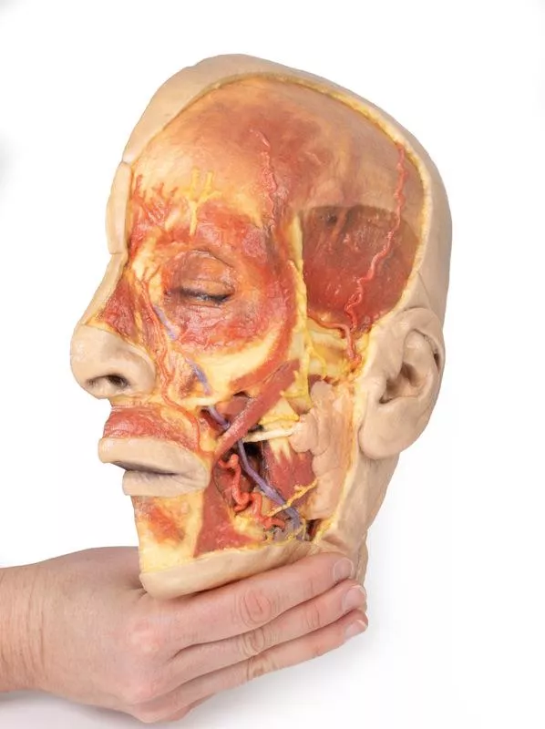 This model offers a concise yet richly detailed view of facial anatomy, ideal for teaching nerve-muscle-vascular relationships in the superficial face.