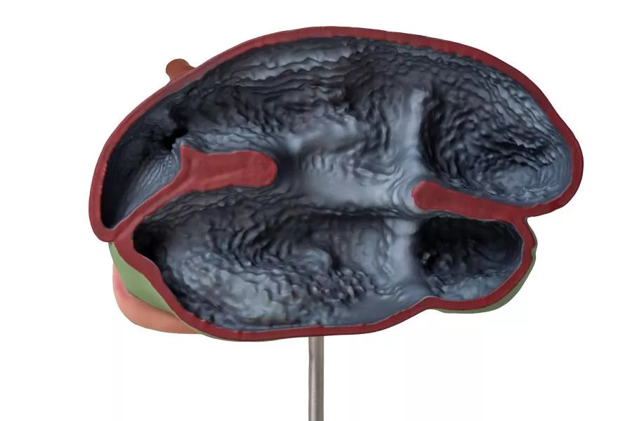 Le rumen et le réticulum peuvent être divisés en deux moitiés pour montrer le relief de la muqueuse de l'estomac. L'omasum et la caillette peuvent être ouverts. Se sépare en 3 parties.